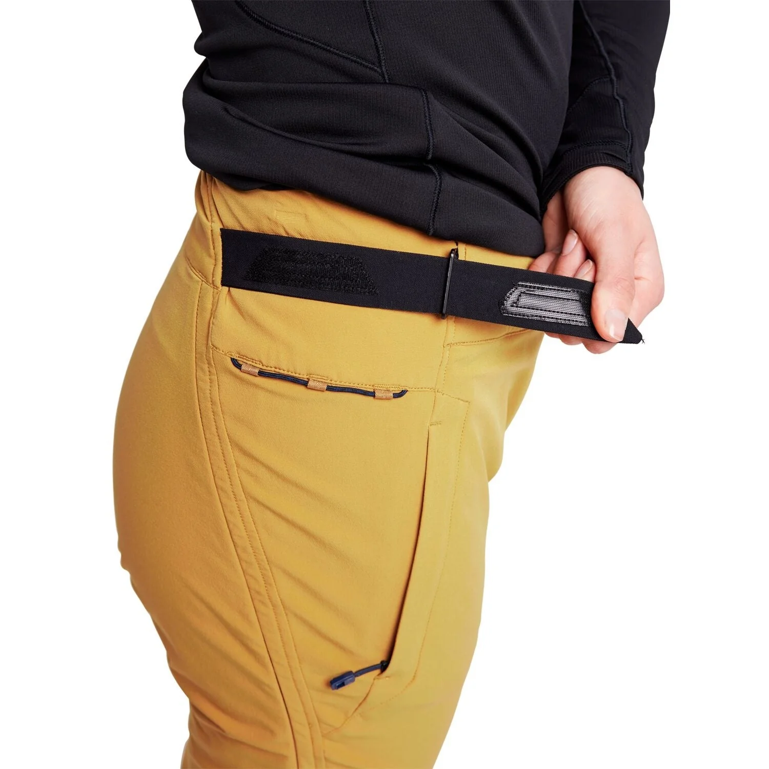 - Waistband with external adjustment and snap closure